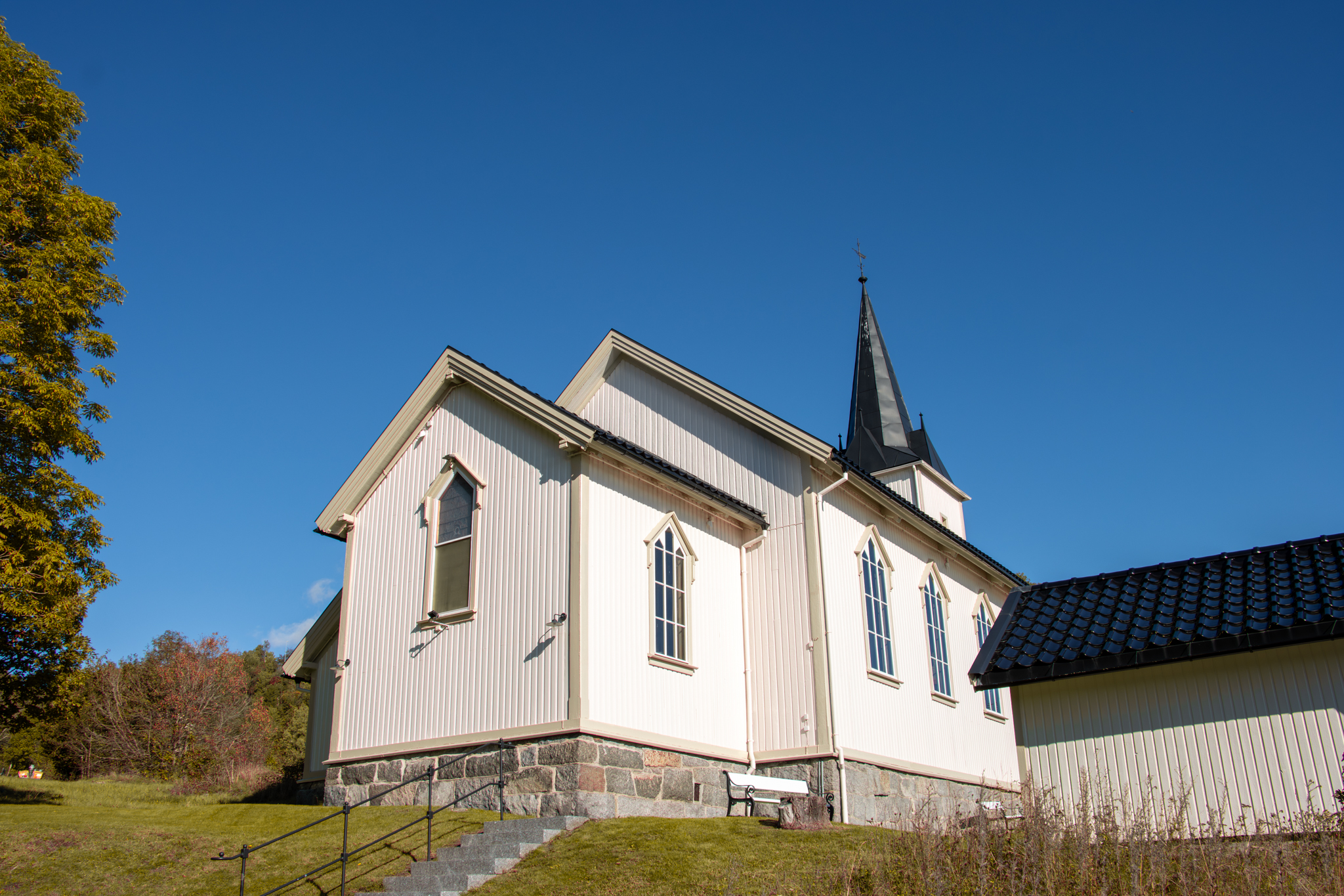 Kirken ligger på en høyde med flott utsikt over fjorden, noe som gir den en idyllisk og fredelig atmosfære
