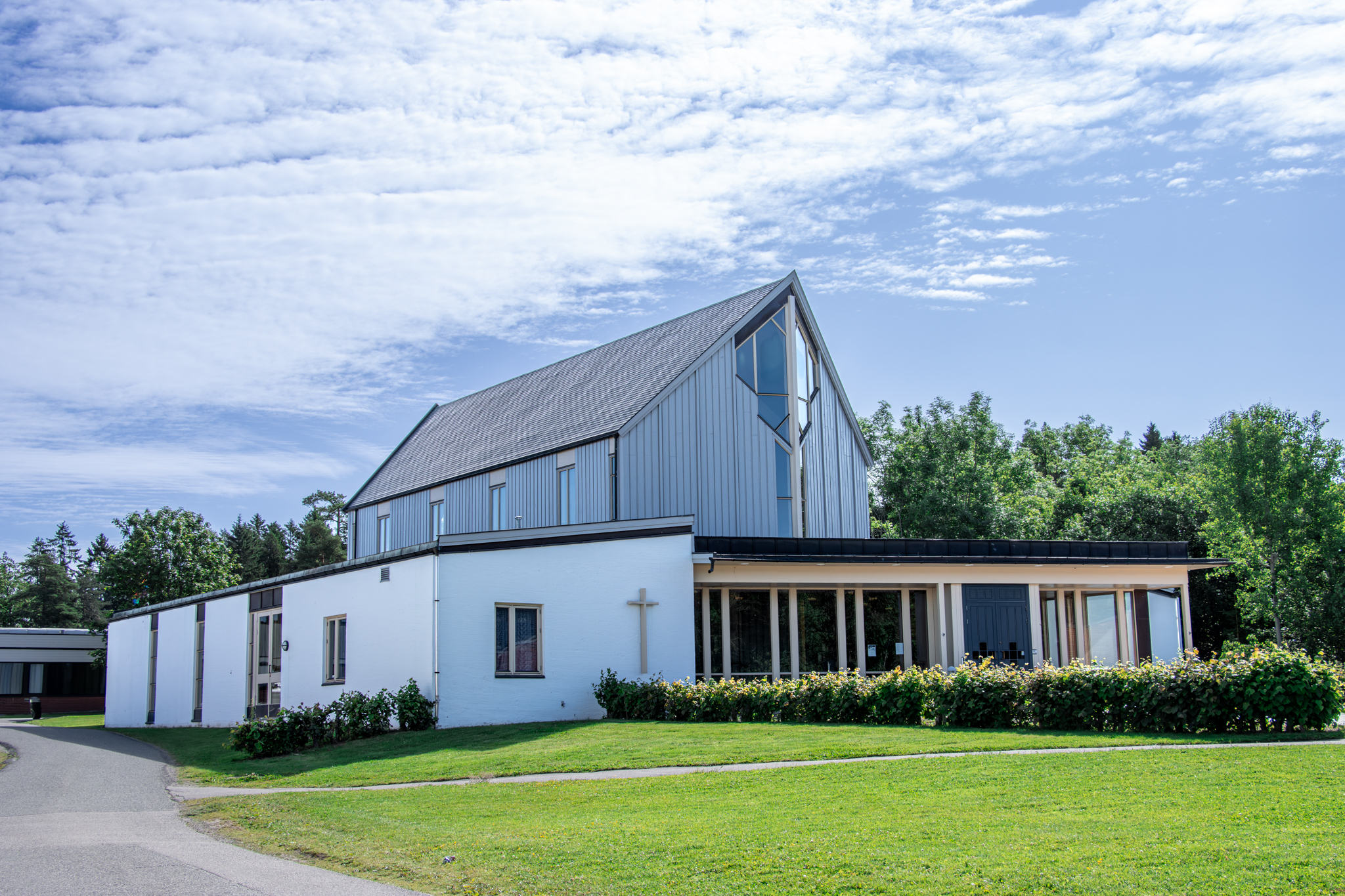 Stridsklev kirke ligger sentralt i Stridsklev, nær skole, svømmehall og butikker