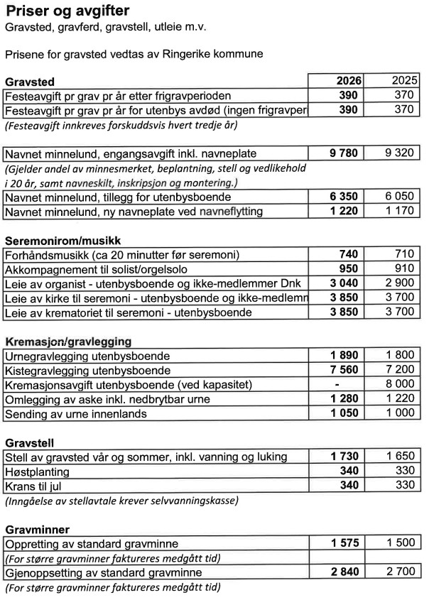 Her er prisene knyttet til gravlegging, kremasjon og festeavgifter